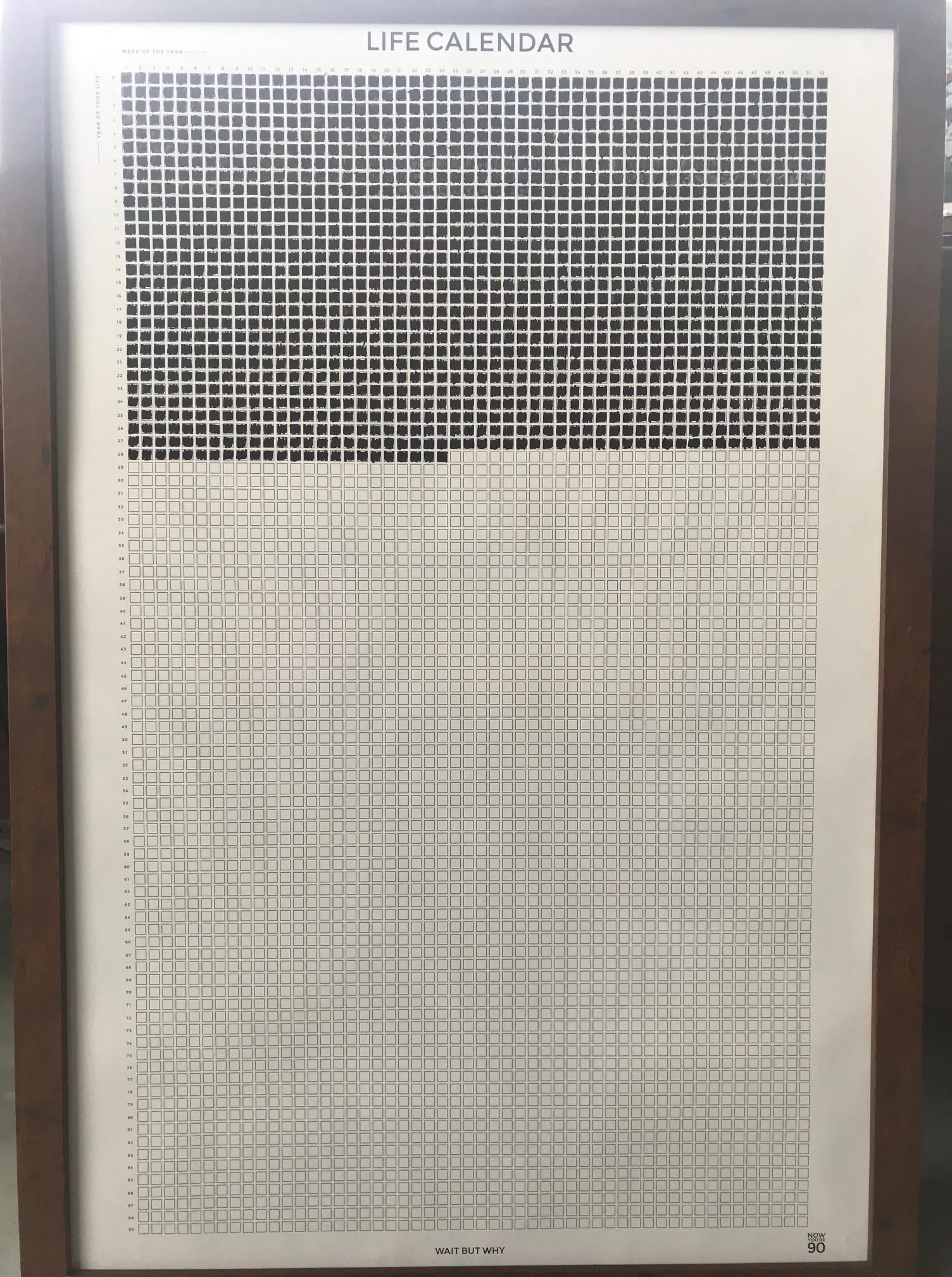 I have a life calendar in my living room that shows how many weeks I have lived and how many weeks I have left to live should I reach the age of ninety (which is generous). I also carry a coin in my pocket at all times that says “Memento Mori” on one side and “You could leave life right now” on the other.